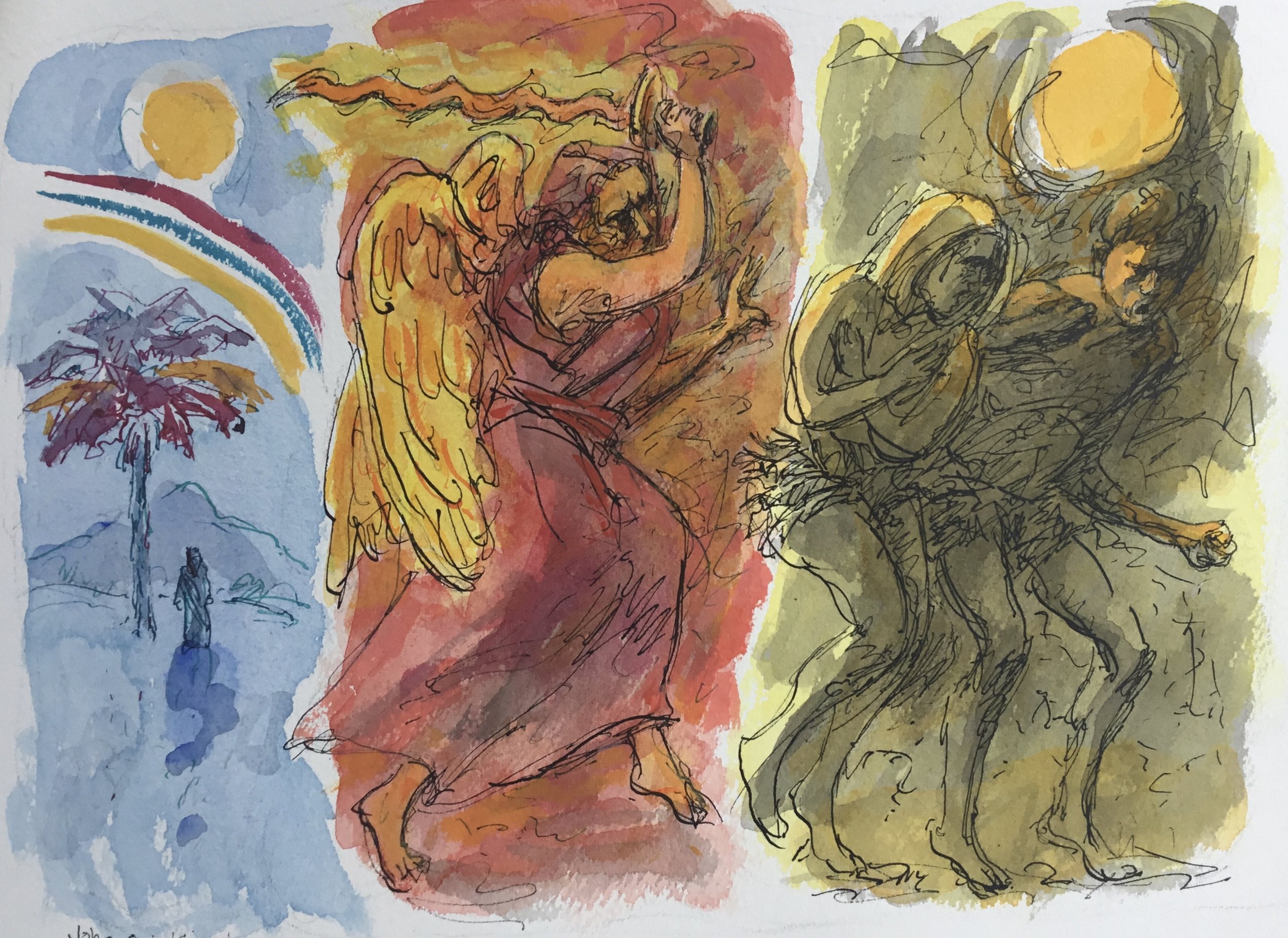 No one should attempt to discern a biblical truth from my drawing. It is what it is, an arrangement of colored lines and shapes. Watercolor and pen and ink are a quick, unpretentious medium, which allows me to create short visual essays. I was exploring the reality of a lost home before time and words, but in the end I wrestle with line and color.